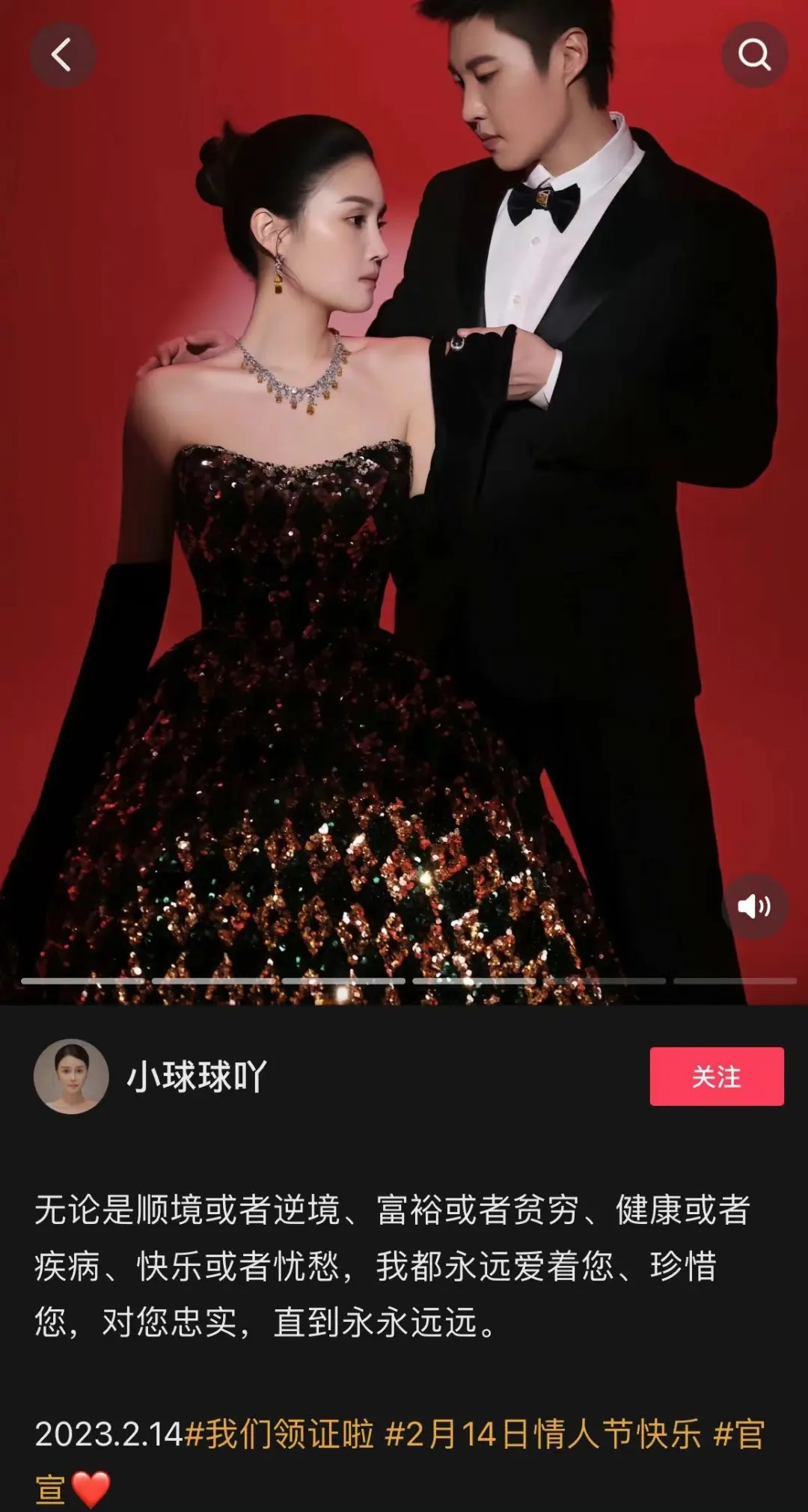 她还在其他平台也发布了结婚领证的消息,晒出多张夫妻甜蜜合照写道:“无论是顺境或者逆境、富俗或者贫穷、健康或者疾病、快乐或者忧愁,我都永远爱着您、珍惜您,对您忠实,直到永永远远。”