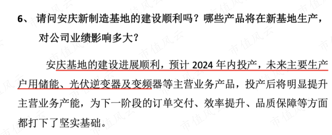 (4)安徽省安庆基地的建设进展顺利,生产户用储能、光伏逆变器及变频器。