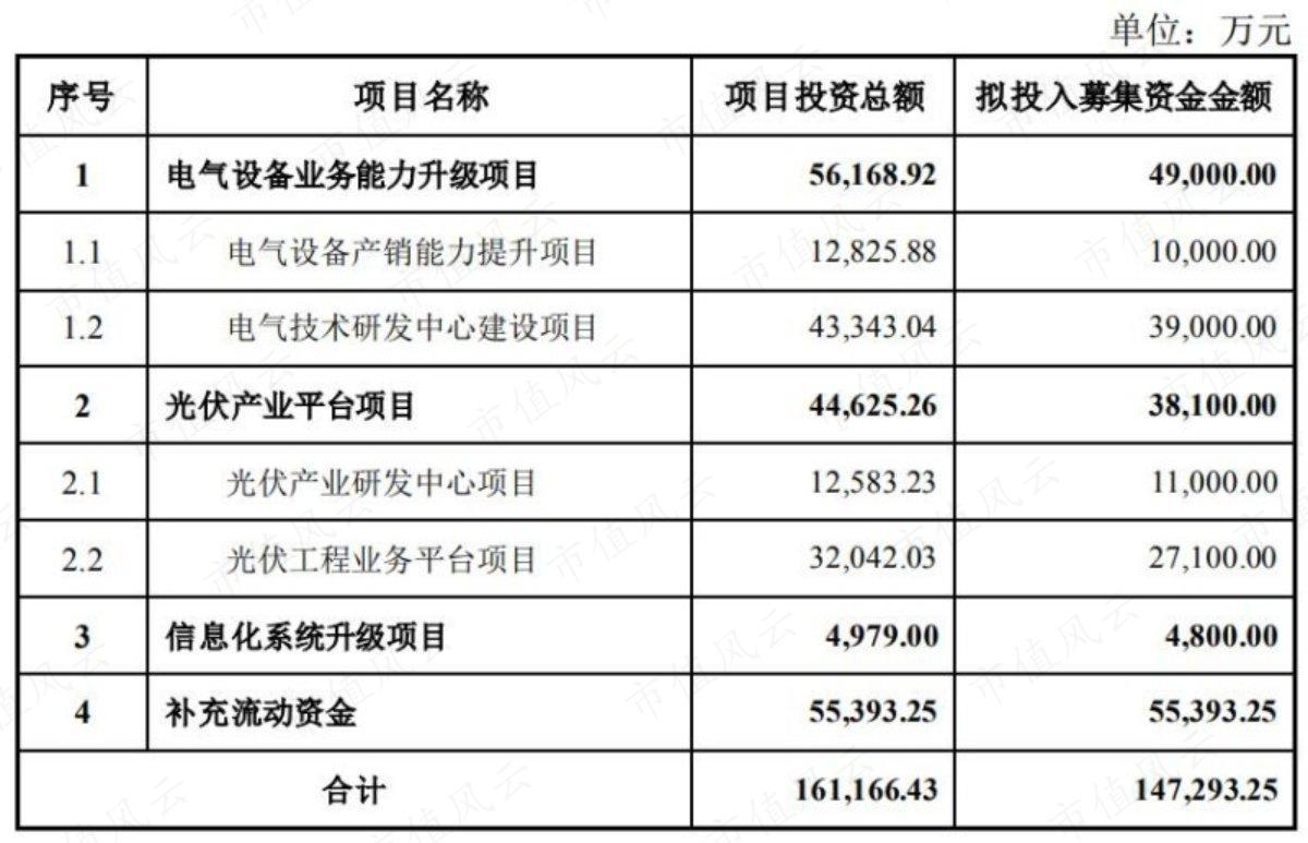 15亿募集资金,将用于电气设备业务能力升级、光伏产业平台、信息化系统升级等三个项目,以及将5.54亿元用于补充流动资金。