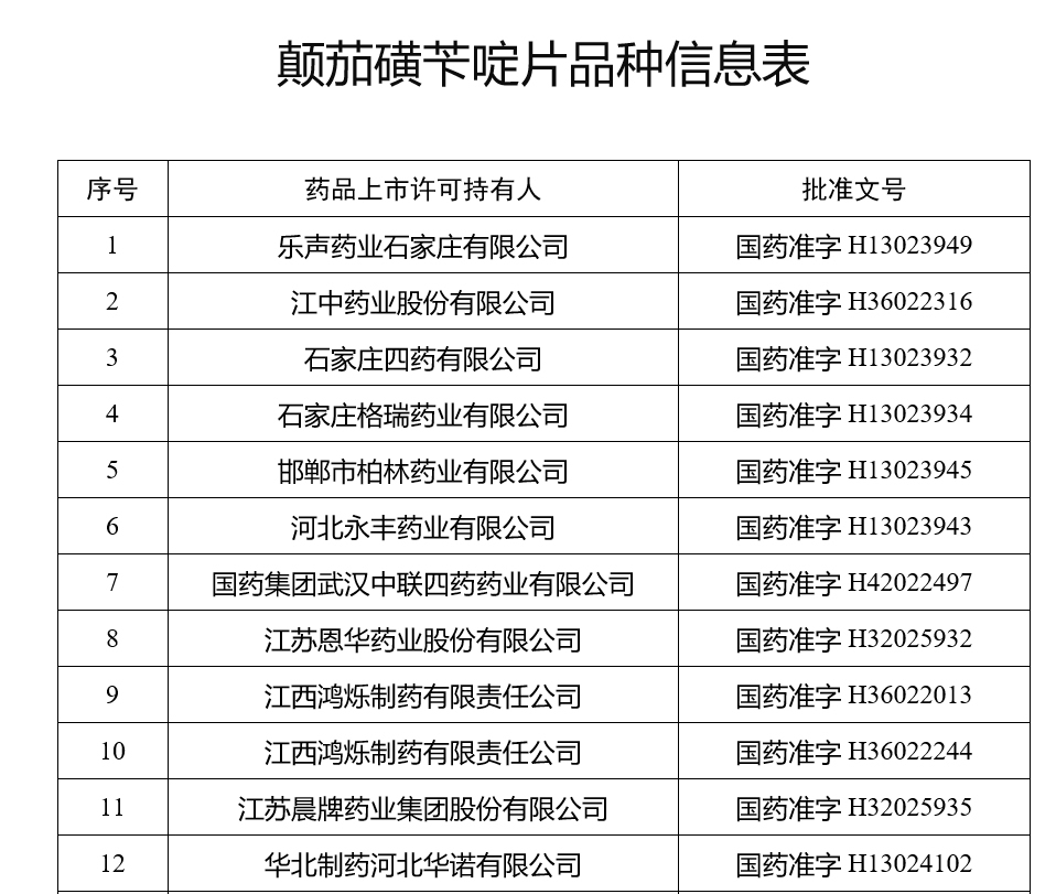 根据国家药监局公布的颠茄磺苄啶片品种信息表,停售颠茄磺苄啶片涉及80家药品上市许可持有人,其中涉及江中药业(600750)、华北制药(600812)、新华制药(000756)、葵花药业(002737)等知名上市药企。