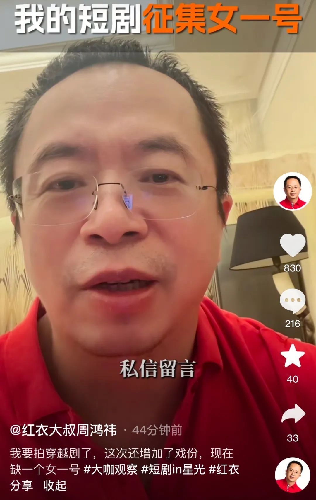 “我们市场部本来想让我演男一号,但如果这样大家肯定就不想看了,我还是演个男二号吧。”周鸿祎还透露,这次的AI短剧大概有60集。