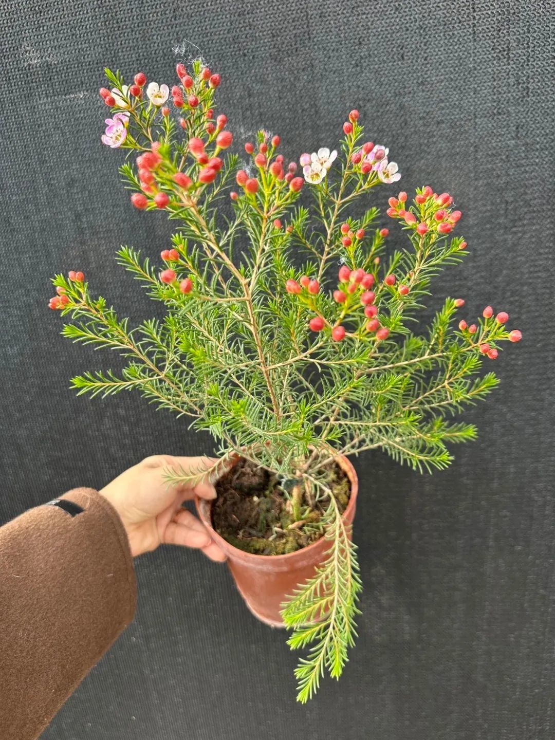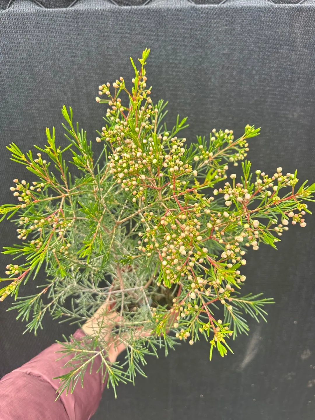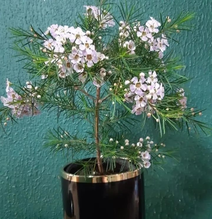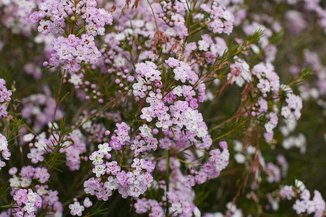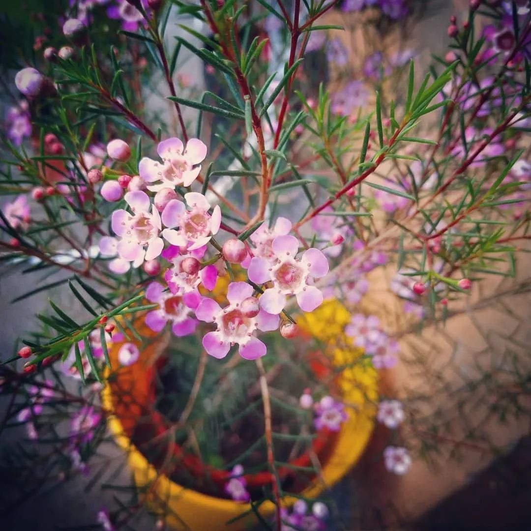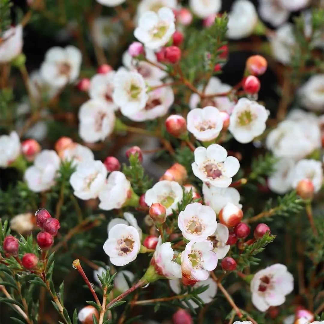 澳洲腊梅是非常好看的一种小灌木植物,它的叶子像松针,花朵星星点点的,花量繁多,如同满树的小梅花,花朵有蜡质的光泽。无论是没开花的小花苞,还是开花后的小花,都很是惹人怜爱。它的花叶还有淡淡的清香。