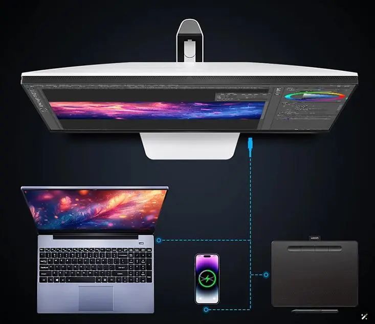 U6 显示器还特别关注到了用户的便捷性,配备了 Type-C 接口,支持一线直连并提供65W的反向充电功能。这对于经常外出办公的用户来说,尤为方便。你只需要一根 Type-C 数据线,就能将笔记本或其他设备与显示器连接,同时还可以为设备充电,避免了繁琐的电源适配器和数据线的缠绕,桌面更加简洁、整洁。