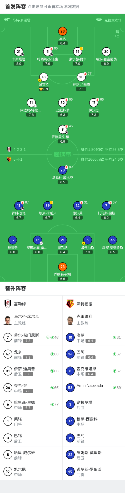 北京时间1月10日英格兰足总杯 第三轮,富勒姆对阵沃特福德。富勒姆罗德里戈-穆尼斯破门,约西姆-安诺生破门,卡斯塔涅破门,劳尔-希门尼斯破门。沃特福德罗科-瓦塔破门。最终比分富勒姆 4-1 沃特福德。