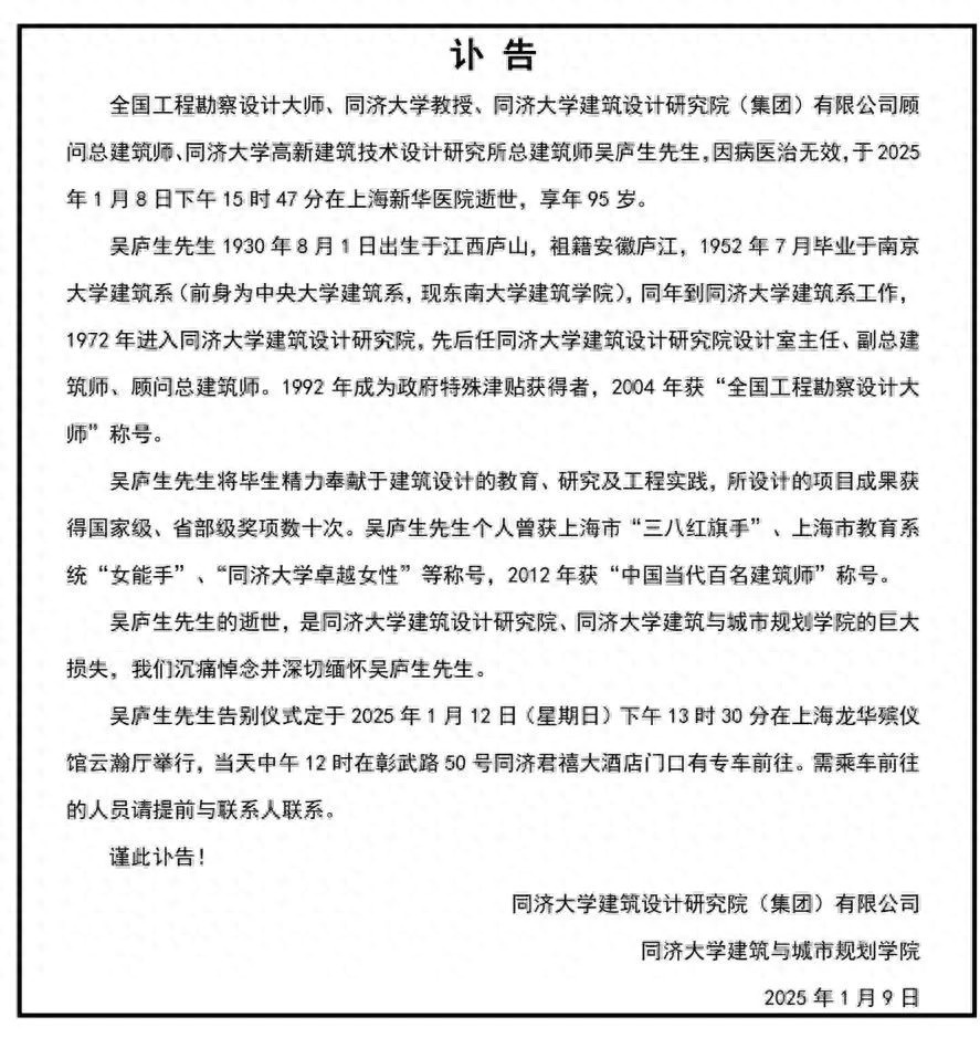 1月9日,同济大学建筑设计研究院(集团)有限公司、同济大学建筑与城市规划学院发布讣告:全国工程勘察设计大师、同济大学教授、同济大学建筑设计研究院(集团)有限公司顾问总建筑师、同济大学高新建筑技术设计研究所总建筑师吴庐生先生,因病医治无效,于1月8日逝世,享年95岁。