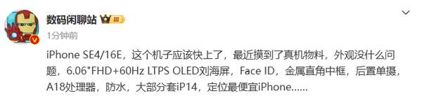 【CNMO科技消息】有大量消息表明,苹果将在2025年上半年发布一款廉价版的iPhone,最终命名可能为iPhone 16E(iPhone SE 4改名)。1月10日,CNMO注意到,知名爆料人士数码闲聊站曝光了这款机型的核心配置。