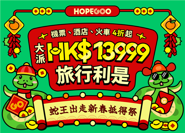 为满足不断增长香港游客的出行需求,HopeGoo在中国传统春节到来之际,正式启动了“蛇王出走新春抵得祭”迎新春推广活动。活动期间,HopeGoo将向用户发放高达千万港币的丰厚出行福利,同时面向八达通用户追加至高达 699港币火车优惠券,这一举措旨在吸引更多用户关注和使用HopeGoo平台。