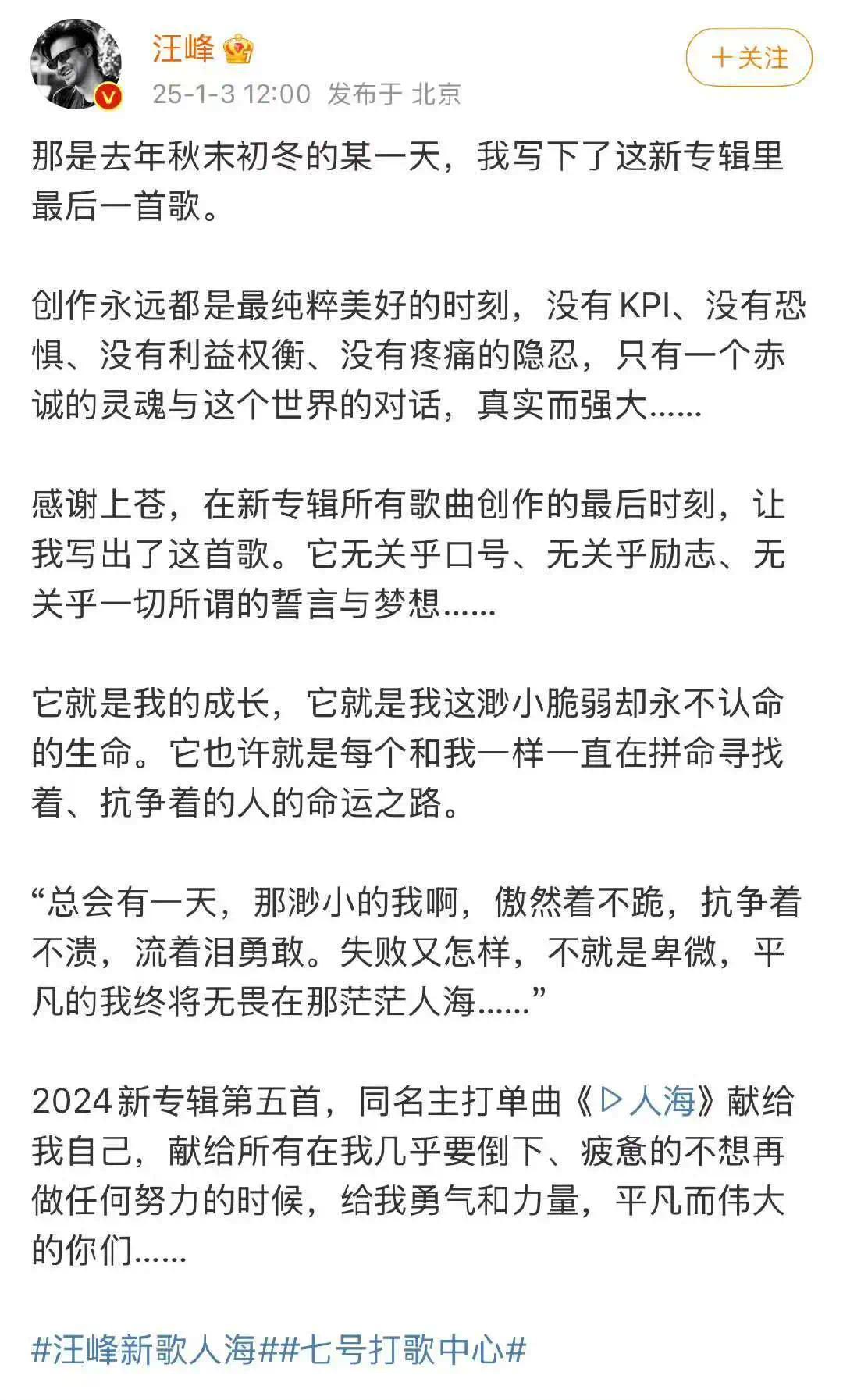 就比如,就在李明德屠榜热搜,与《三人行》剧组在各大头条战个痛快之时,汪峰老师,发出了他新专辑的第五首歌。