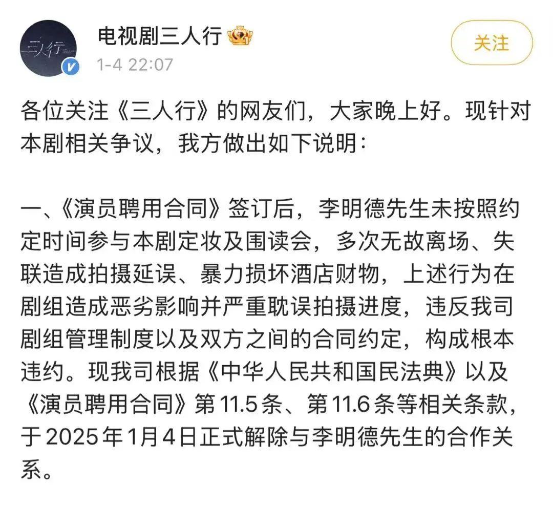 当天晚上10点左右,李明德的经纪公司和《三人行》剧组,先后做了回应。