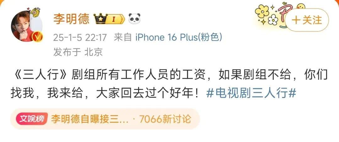 并且,在第一次直播结束后,李明德也发了微博,称如果《三人行》剧组的工作人员拿不到工资,可以找他要,就为了让大家可以回去过个好年。