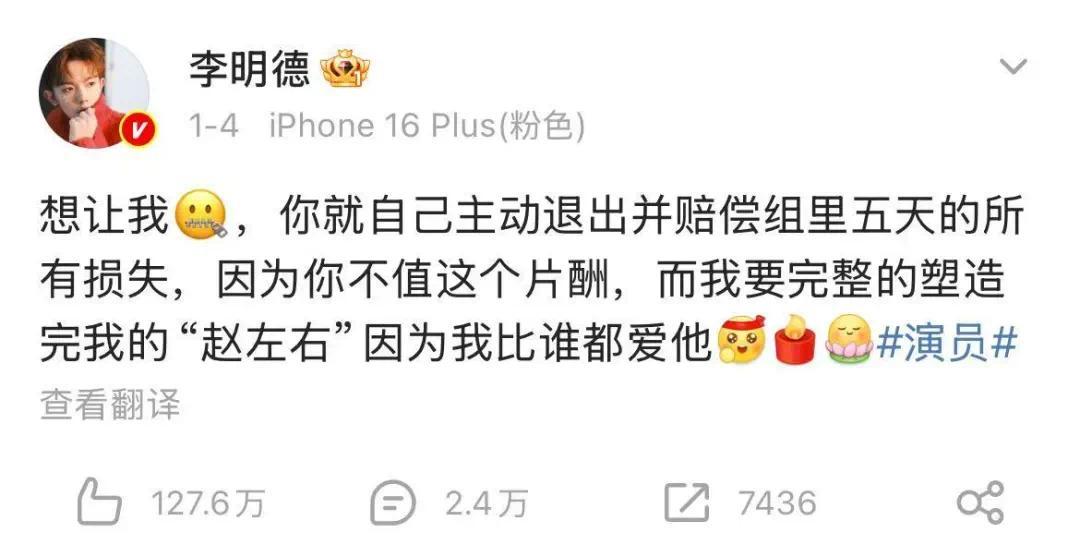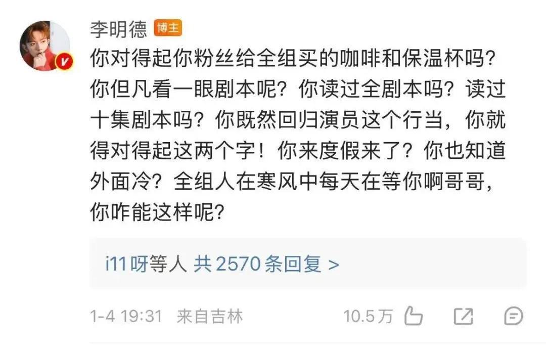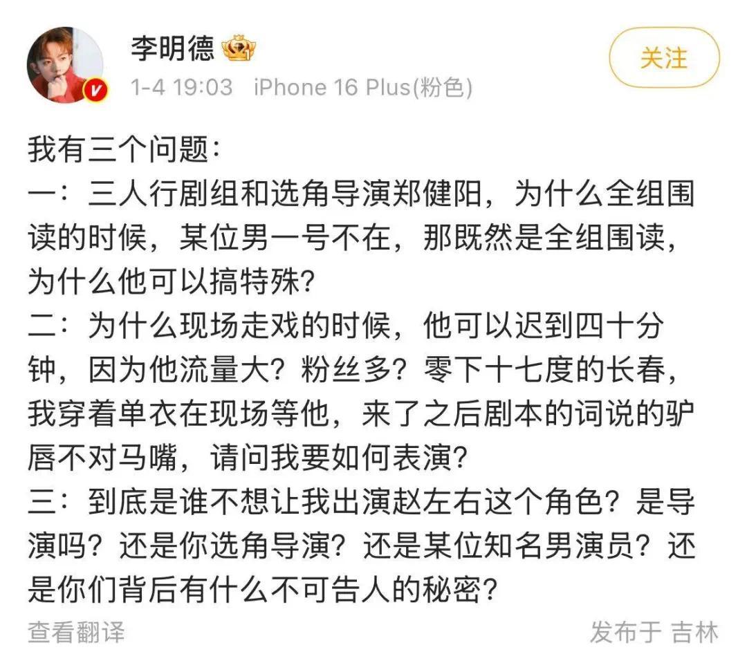 剧组这边还在推敲微博文案,李明德那边已经实名贴脸开大。