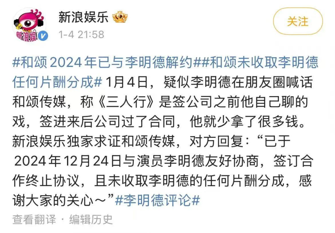 经纪公司称,去年就已经和李明德“友好协商”并“终止协议”。