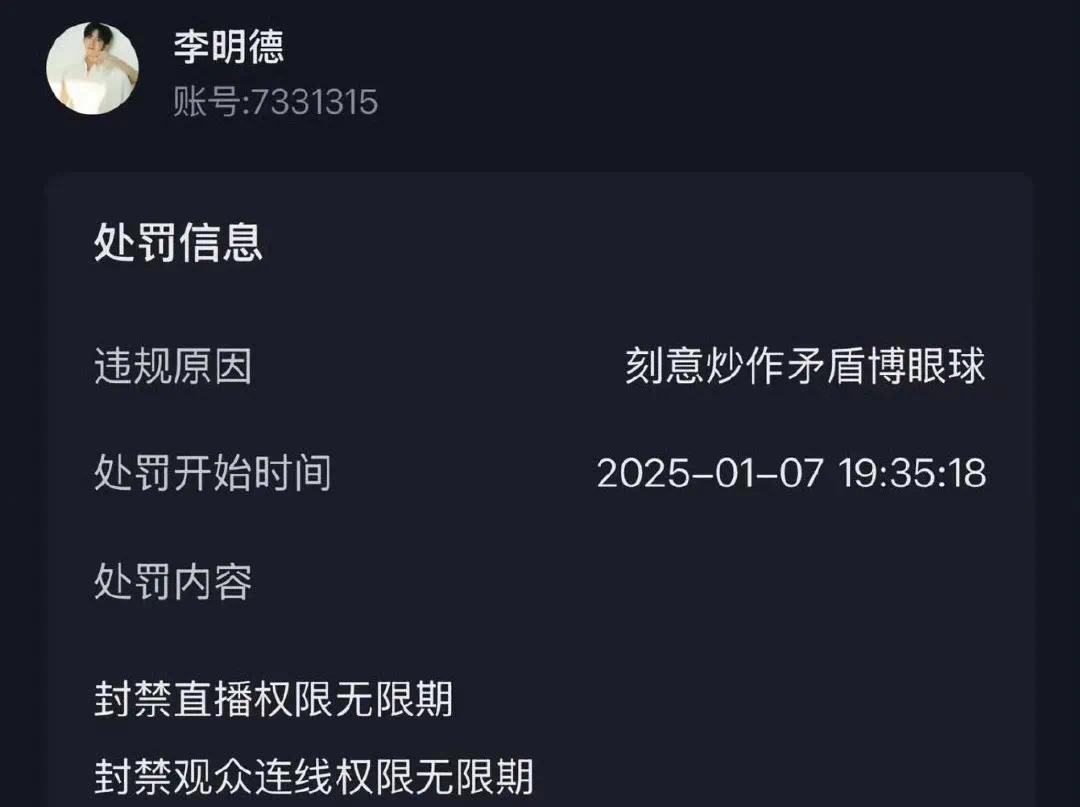 昨晚(1月7日),李明德直播被平台永久封禁,理由是:“刻意炒作矛盾博眼球”。