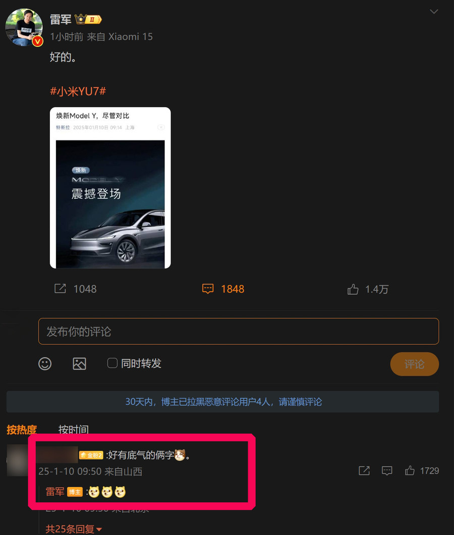 接着就是咱军儿和小米的新车——小米YU7,显然这场对决不只是科技圈和车圈的热议。对于特斯拉下的“战术”,雷军今日直接发了条微博,并且十分干脆利落的就俩字:“好的!”。