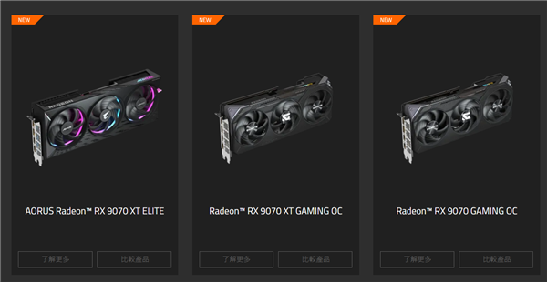 这三款显卡分别是AORUS Radeon RX 9070 XT ELITE、Radeon RX 9070 XT GAMING OC和Radeon RX 9070 GAMING OC。