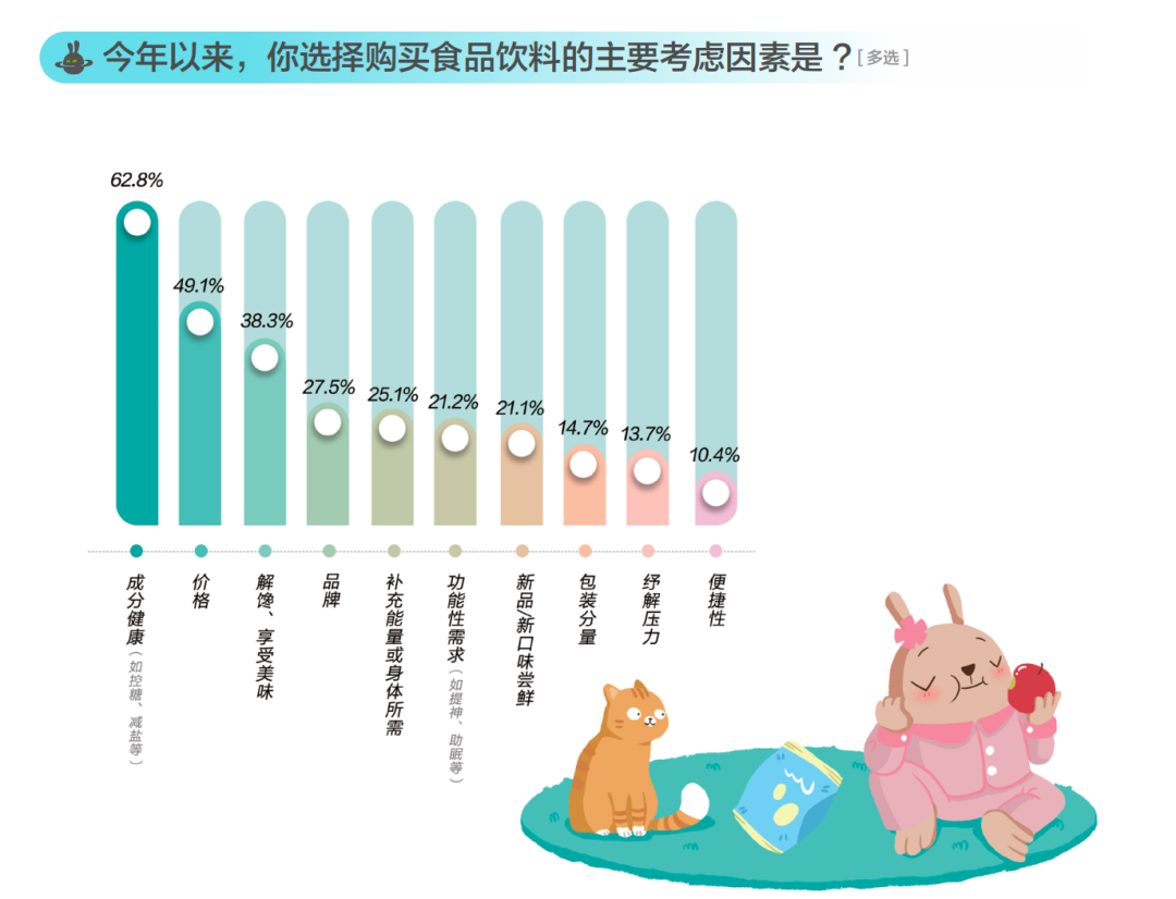 当下,年轻人普遍追求吃得健康。据《2024有意思生活方式报告》统计,2024年,消费者选择购买食品饮料的主要考虑因素中,成分健康占据首位,且比例远高于排名第二的价格因素。