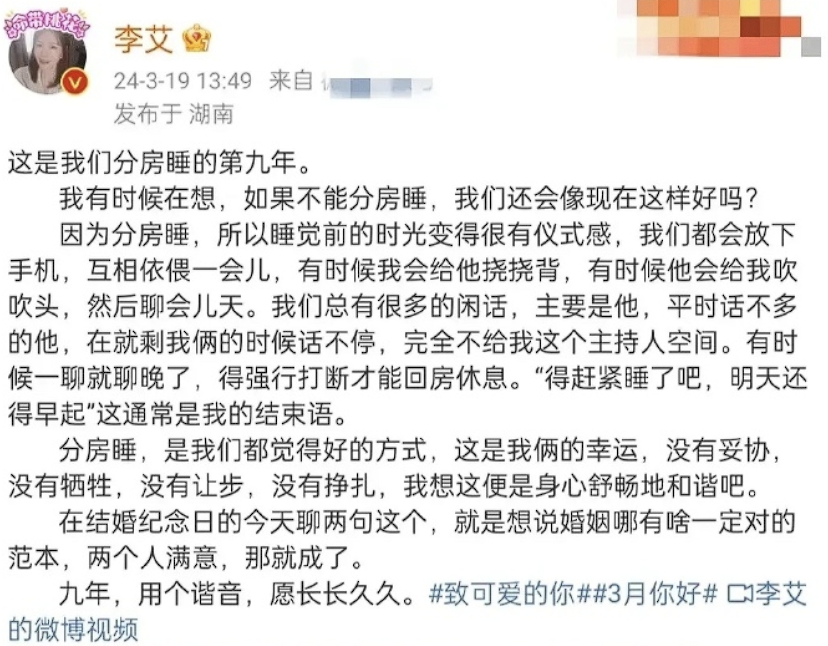 没想到,李艾却大方承认结婚以来,两人一直都是分房睡的状态。