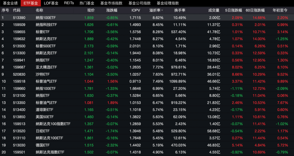 截至当日收盘,博时纳斯达克100ETF、景顺长城纳斯达克科技市值加权ETF、华夏标普500ETF、华安纳斯达克100ETF、博时标普500ETF分别收跌0.85%、0.61%、3.56%、0.42%、0.59%,溢价率则分别降至为8.62%、8.45%、8.28%、8.27%、8.10%。