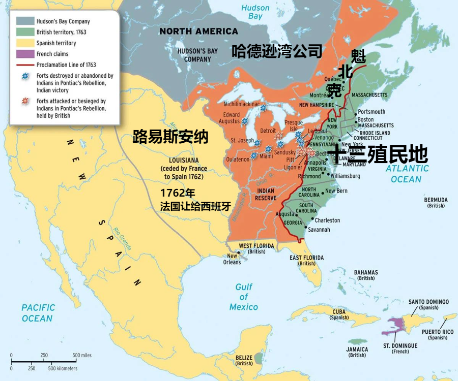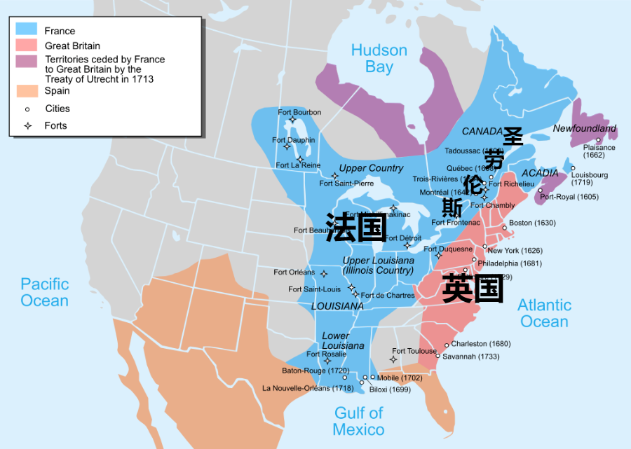 截至17世纪中期,英国和法国是瓜分北美的两大势力。法国在建立了北起哈德逊湾,南至墨西哥湾的“新法兰西”殖民地,英国主要在靠近大西洋沿岸建立起13块殖民地。