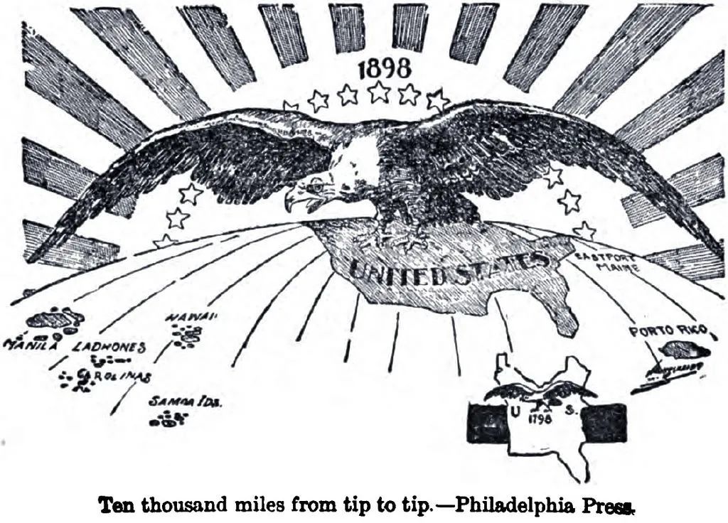 ▲1898年漫画《自此至彼相隔万里》,以白头海雕(美国国鸟)代表美国领土扩张至波多黎各与菲律宾