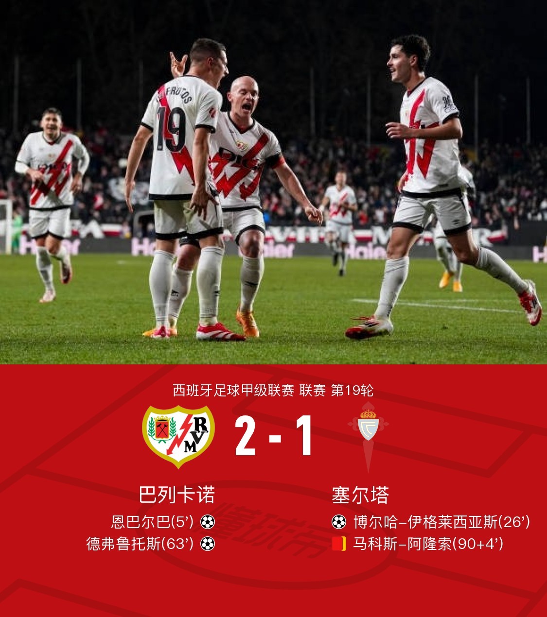 北京时间1月11日西班牙足球甲级联赛 联赛 第19轮,巴列卡诺主场对阵塞尔塔。巴列卡诺恩巴尔巴破门,德弗鲁托斯破门。塞尔塔博尔哈-伊格莱西亚斯破门。最终比分巴列卡诺 2-1 塞尔塔。