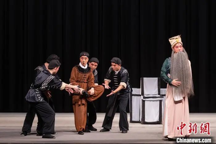 2024年12月29日,林小宝(右一)在台北参加公益演出,饰演京剧《打渔杀家》里的萧恩。(受访者供图)