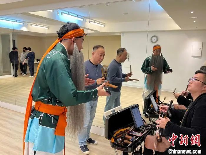 2024年10月23日,在台北的一间排练室,林小宝(左一)在台湾戏曲学院京剧团团长张德天(左二)指导下,排练京剧唱段。中新社记者 路梅 摄