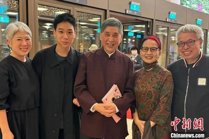 2024年,青春版《牡丹亭》在台北演出期间,林小宝(左二)与家人前往观看,并与该戏总制作人、台湾作家白先勇(左三)合影。(受访者供图)