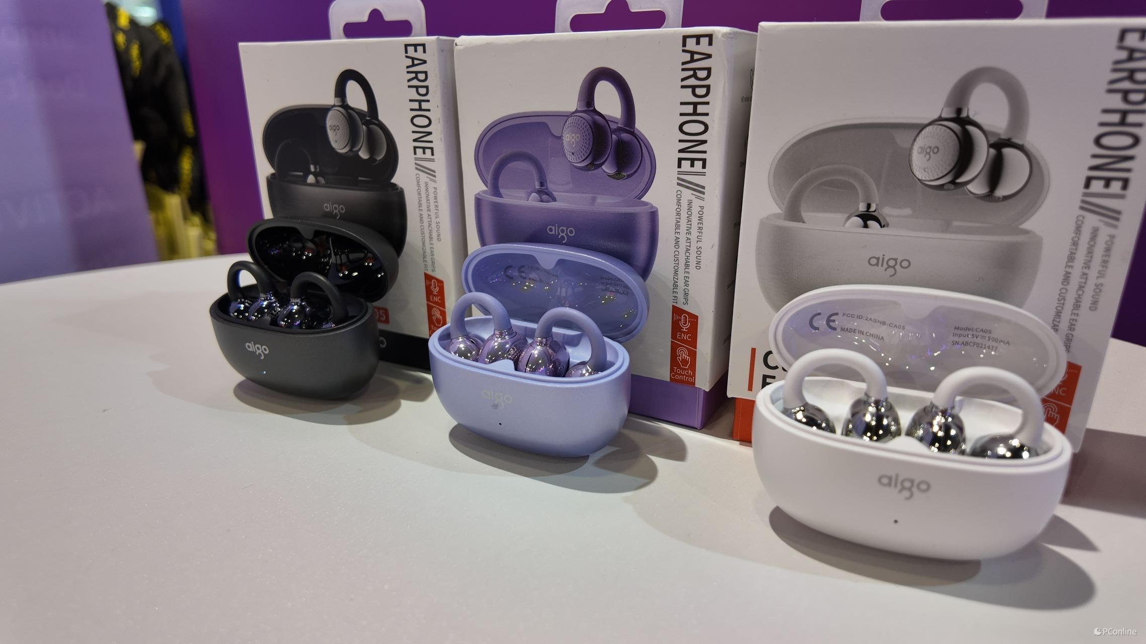 在熙攘的人群中,我们来到了aigo的音频产品线展区,aigo的音频产品涉猎广泛,从TWS耳机到骨传导耳机、HiFi音乐播放器一应俱全。其中的拳头产品当然要数aigo 耳夹式蓝牙无线耳机CA05,它拥有一个圆润如鹅卵石般的电池仓,耳机本体则是时下流行的夹耳式设计,这种耳机能带来舒适的佩戴体验,在定向传音技术的加持下,CA05能做到定向传声不漏音,有效保护用户的隐私安全,还有56小时超长续航。