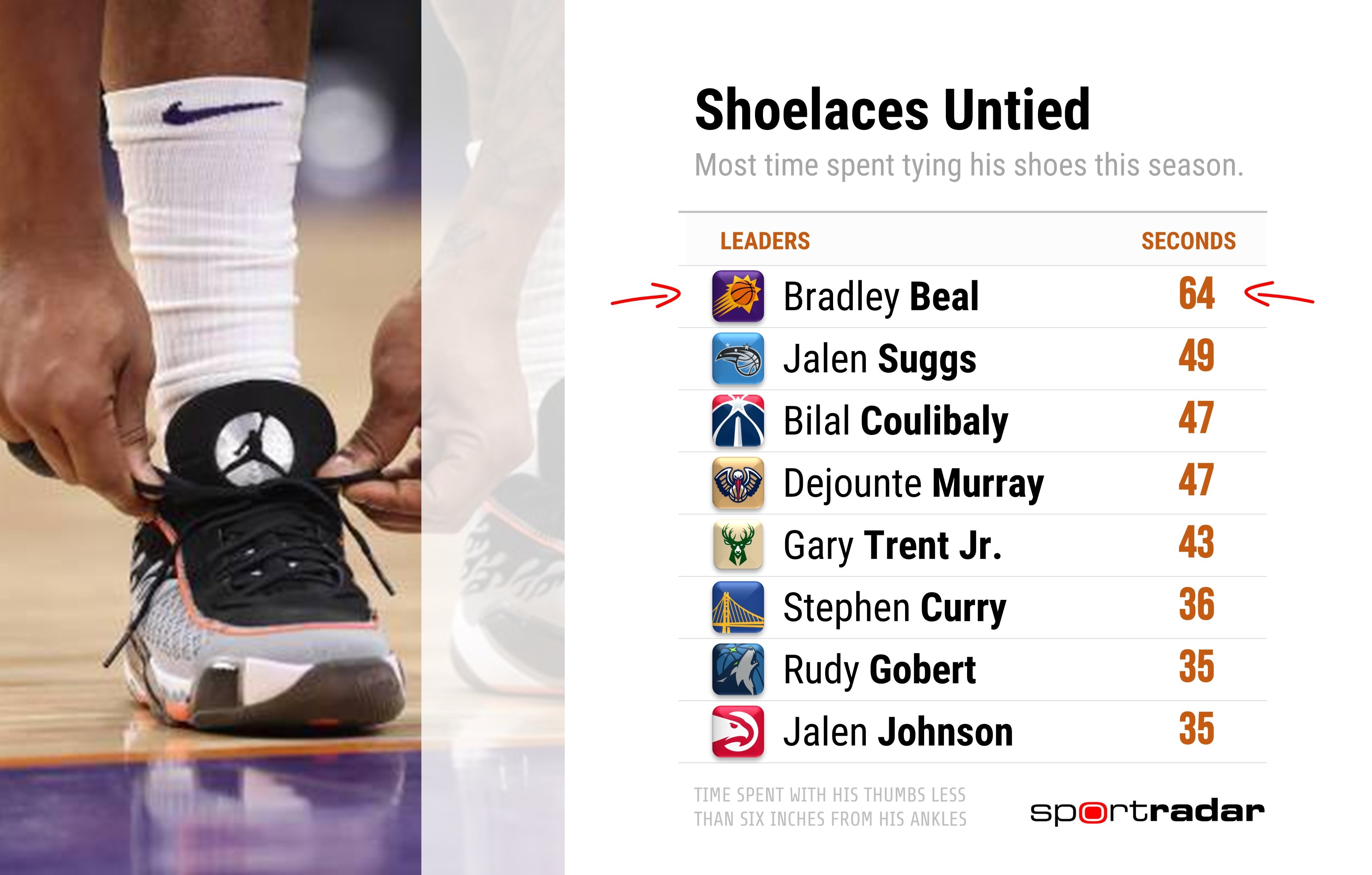 北京时间1月11日,美国媒体进行了一项奇葩的数据统计:本赛季哪位NBA球员系鞋带的时间最长?结果显示,太阳队球员布拉德利-比尔以64秒领跑全联盟。