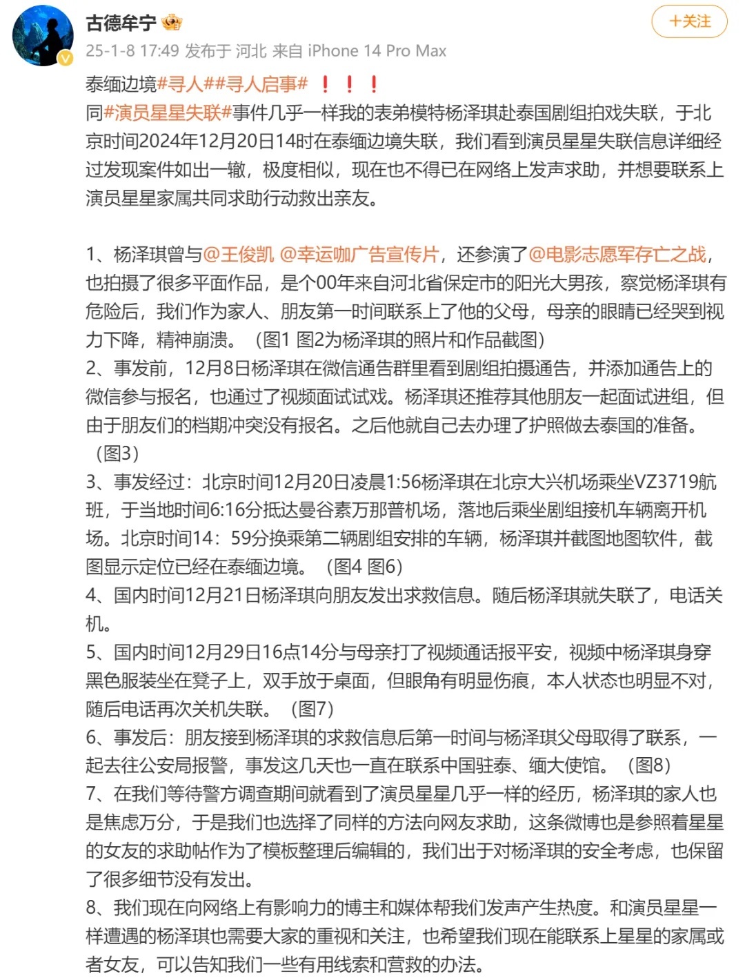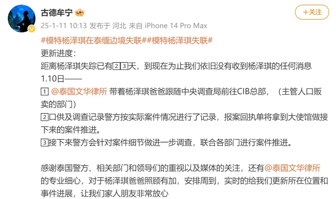 1月8日晚,25岁模特杨泽琪家人在社交平台求助,称杨泽琪于2024年12月20日在泰缅边境失联,与演员王星失联经历极度相似。