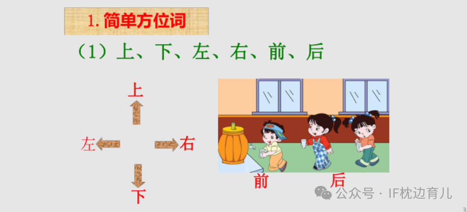 Tips:个体方位知觉的发展顺序是先上下,再前后,最后是左右。所以,刚开始不必太着急,可以按照顺序慢慢引导。