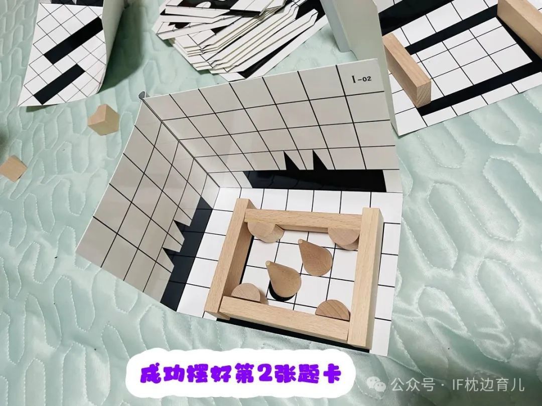 有张题卡大宝和二宝怎么也摆放不出来,他俩托着脸思考,怎么回事呢?我说,是不是有难度了?你们可以看看,这个玩具,设计的底层逻辑是什么?翻开玩法手册才知道,原来是利用了三视图的原理。