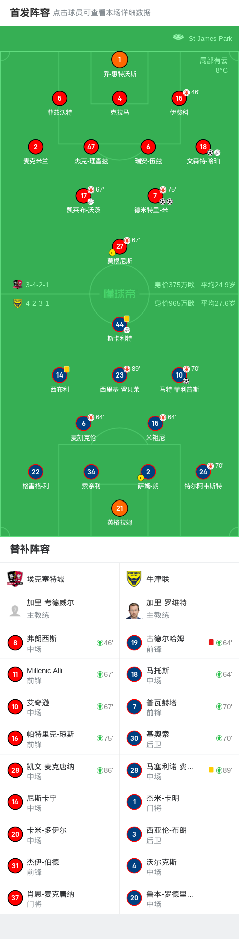 第64分钟,埃克塞特城球员凯莱布-沃茨助攻文森特-哈珀打入一球。
