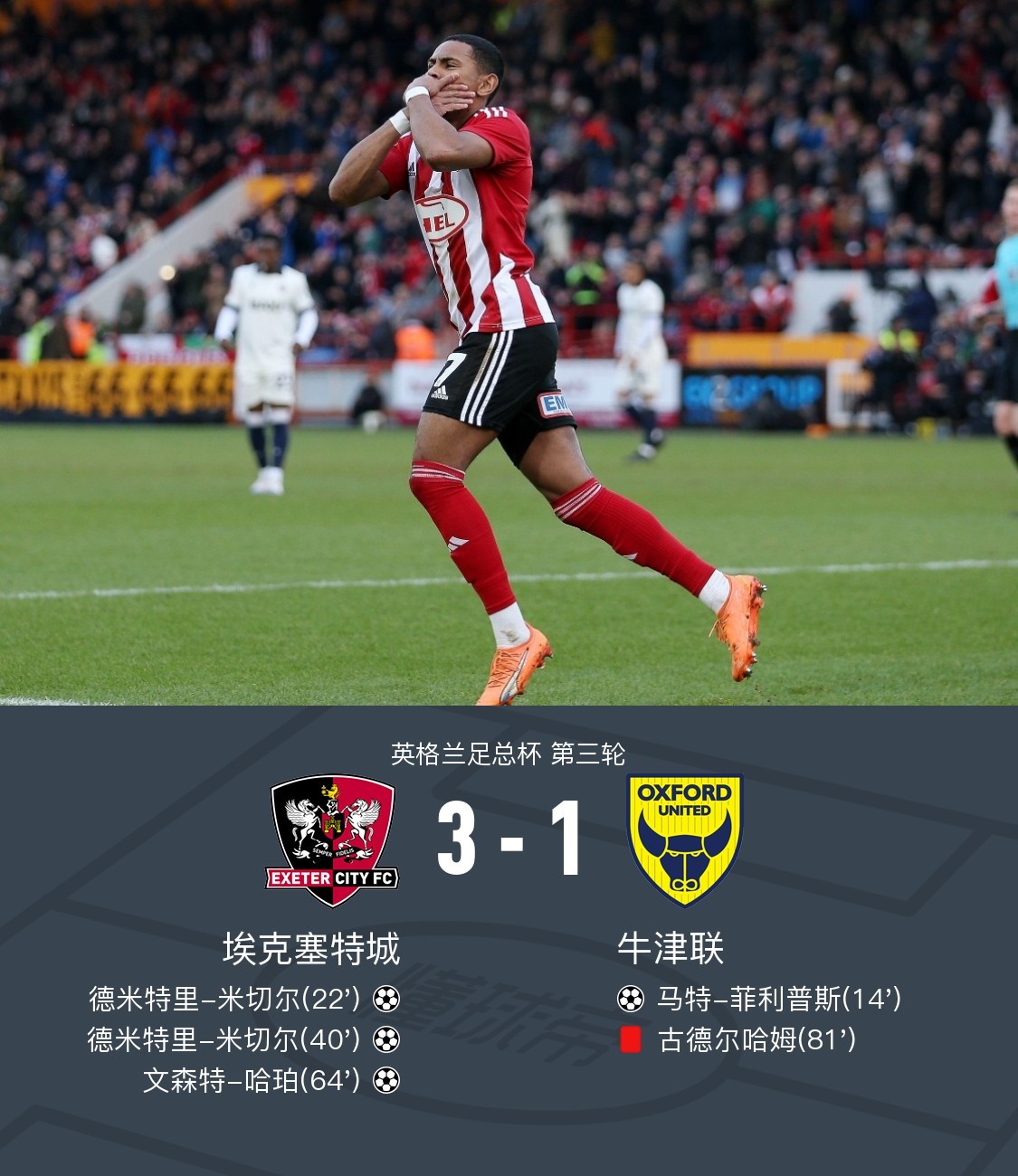 在英格兰足总杯第三轮的较量中,埃克塞特城迎战牛津联。比赛中,牛津联的马特-菲利普斯率先破门,为球队取得领先。随后,埃克塞特城的文森特-哈珀助攻德米特里-米切尔扳平比分。紧接着,德米特里-米切尔再度建功,帮助埃克塞特城反超。下半场,凯莱布-沃茨助攻文森特-哈珀,再下一城,进一步扩大了埃克塞特城的领先优势。比赛接近尾声时,牛津联的古德尔哈姆被罚下场,球队陷入困境。最终,埃克塞特城以3-1战胜牛津联,取得胜利。