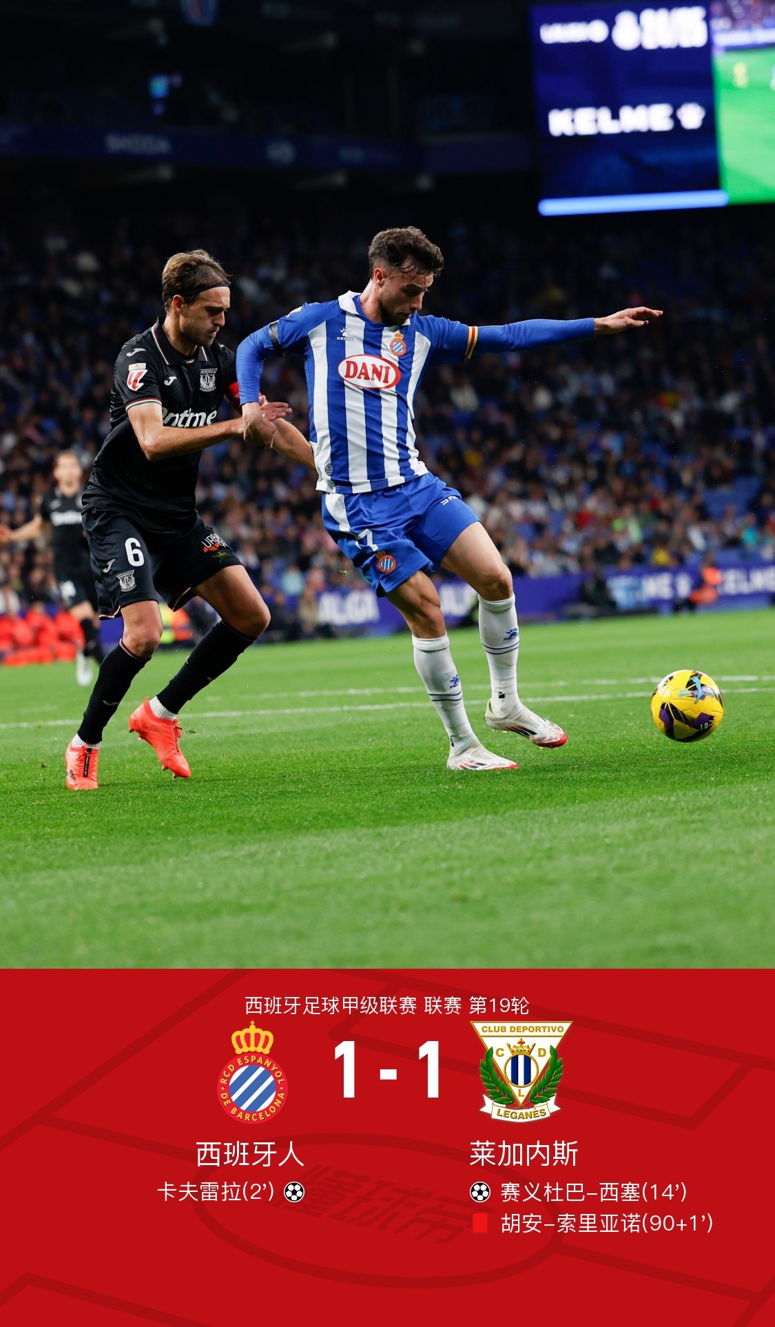 北京时间1月12日西班牙足球甲级联赛 联赛 第19轮,西班牙人主场对阵莱加内斯。西班牙人卡夫雷拉破门。莱加内斯赛义杜巴-西塞破门。最终比分西班牙人 1-1 莱加内斯。