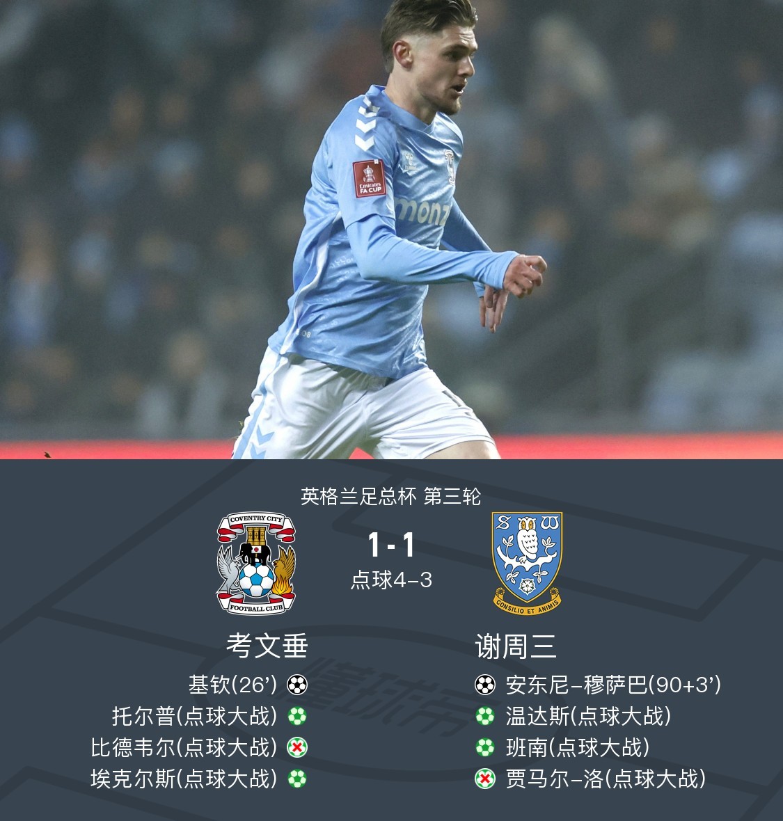 北京时间1月12日英格兰足总杯 第三轮,考文垂对阵谢周三。考文垂基钦破门。谢周三安东尼-穆萨巴破门。最终比分考文垂 5-4 谢周三。