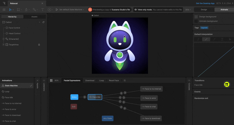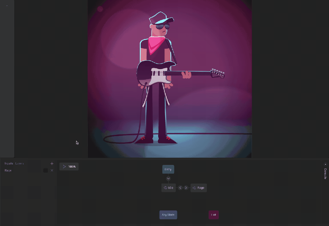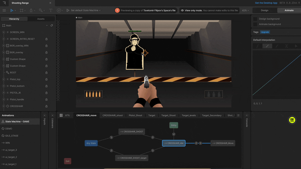 交互,是让动画从“花瓶”变身“互动精灵”的魔法。Rive手握“交互秘籍”,状态机、输入控制、约束等工具一应俱全。凭借状态机,动画能根据用户不同操作切换多种状态,游戏里角色的攻击、防御、待机动作无缝衔接;网页按钮也能实现悬停变色、点击放大等丰富交互,复杂逻辑轻松拿捏。