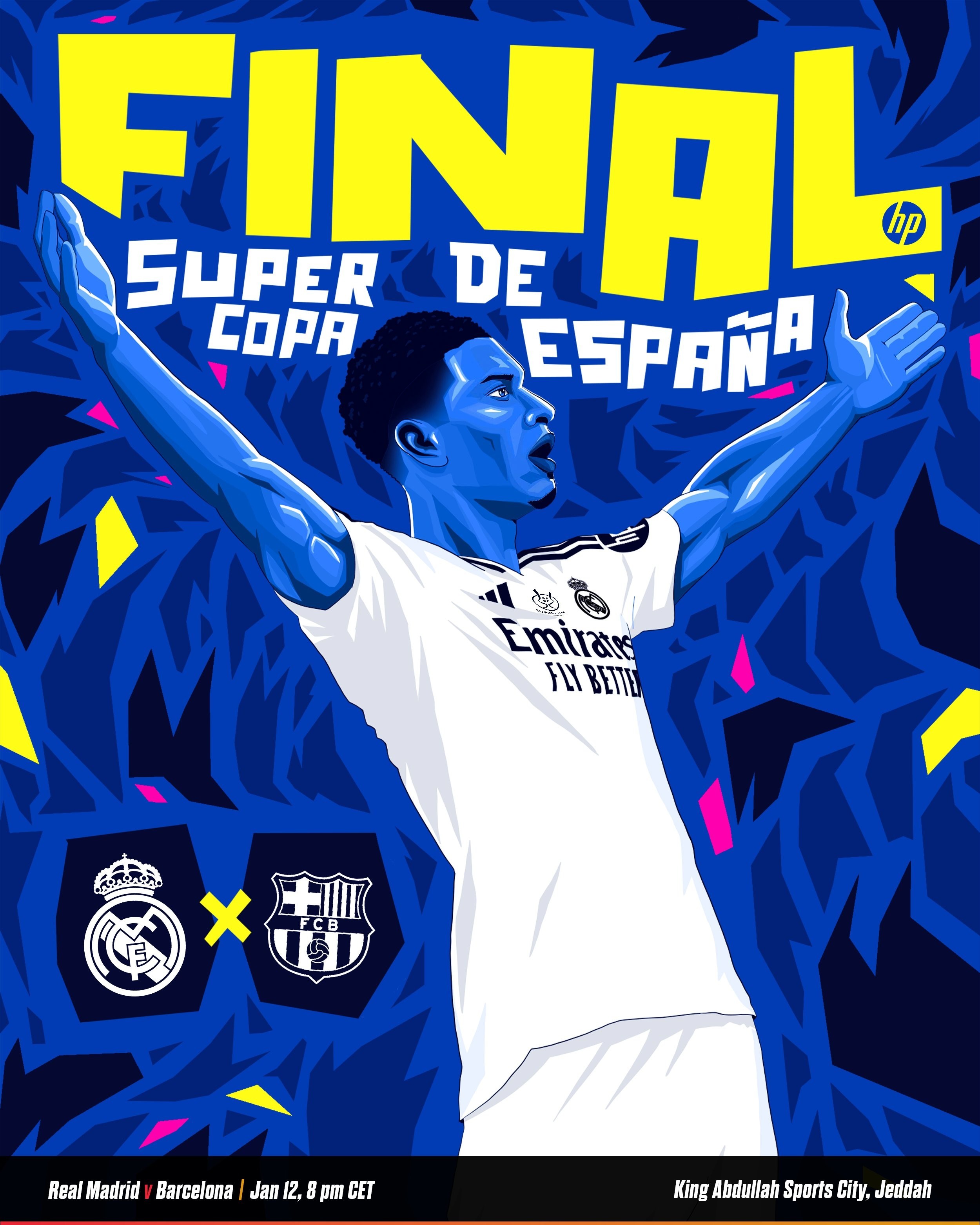 皇家马德里将与巴塞罗那争夺西班牙超级杯冠军,皇马官方在赛前发布了本场比赛海报。