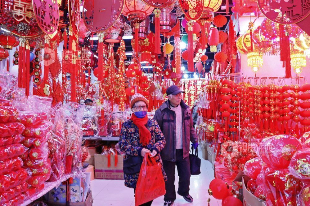 2025年1月12日,江西省南昌市万寿宫历史文化街区新年饰品卖场红红火火,市民正忙着采购春联和新年饰品。春节临近,江西省南昌市年味日渐浓郁,人们已经开始置办年货,在喜庆的氛围中迎接新春佳节。 视觉江西 袁骏 摄