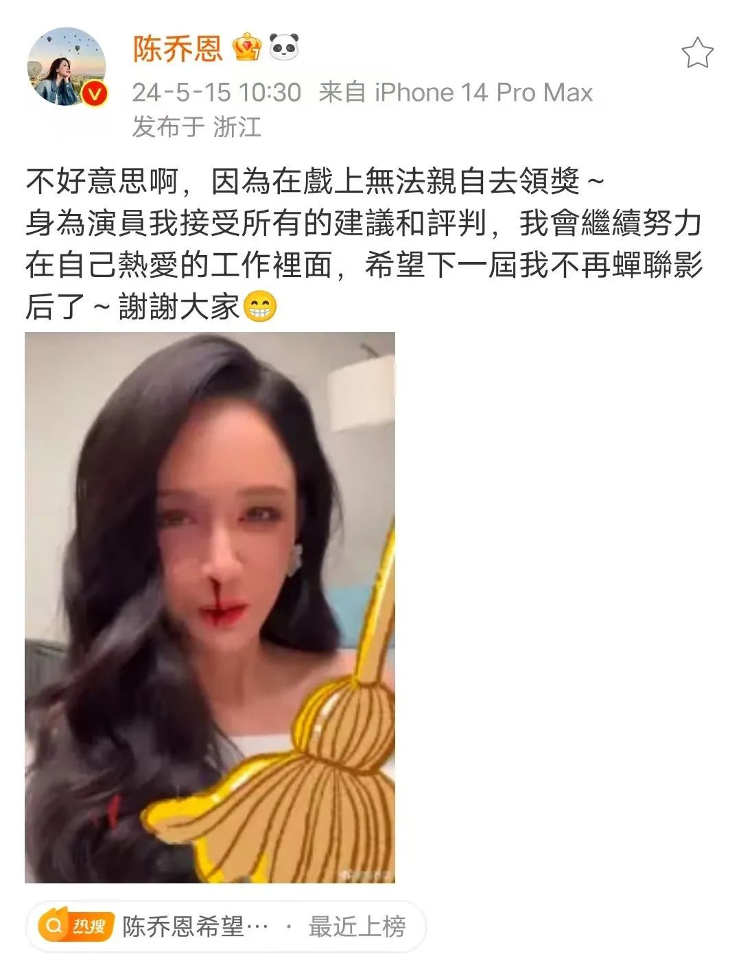 他直接大大方方上台领奖,并向观众道歉。