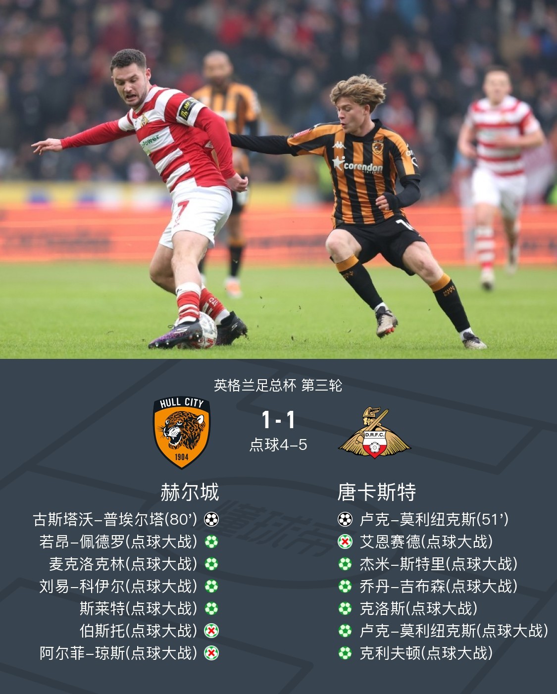 北京时间1月12日英格兰足总杯 第三轮,赫尔城对阵唐卡斯特。赫尔城古斯塔沃-普埃尔塔破门。唐卡斯特卢克-莫利纽克斯破门。最终比分赫尔城 5-6 唐卡斯特。