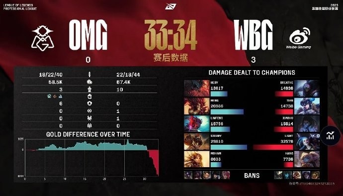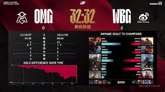 第32分钟,WBG中路推进率先击杀Starry,随后高地团灭OMG一波结束本局比赛,18-11。