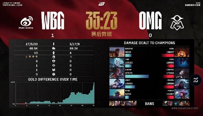 第35分钟,WBG大龙推进打出0换4后顺利拆掉OMG水晶赢下首局,17-5。
