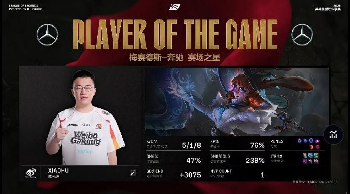 第2分钟,WBG中野追击,双方打出1换1,Xiaohu拿到一血,1-1(WBG在前)。
