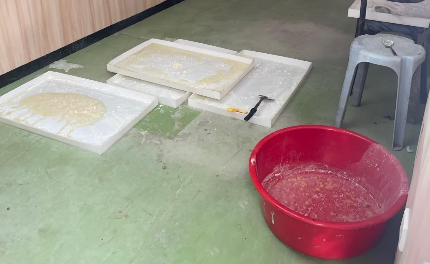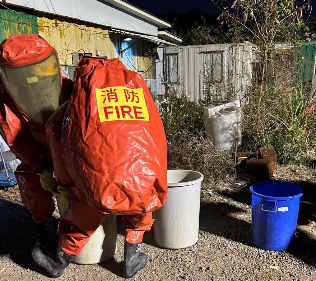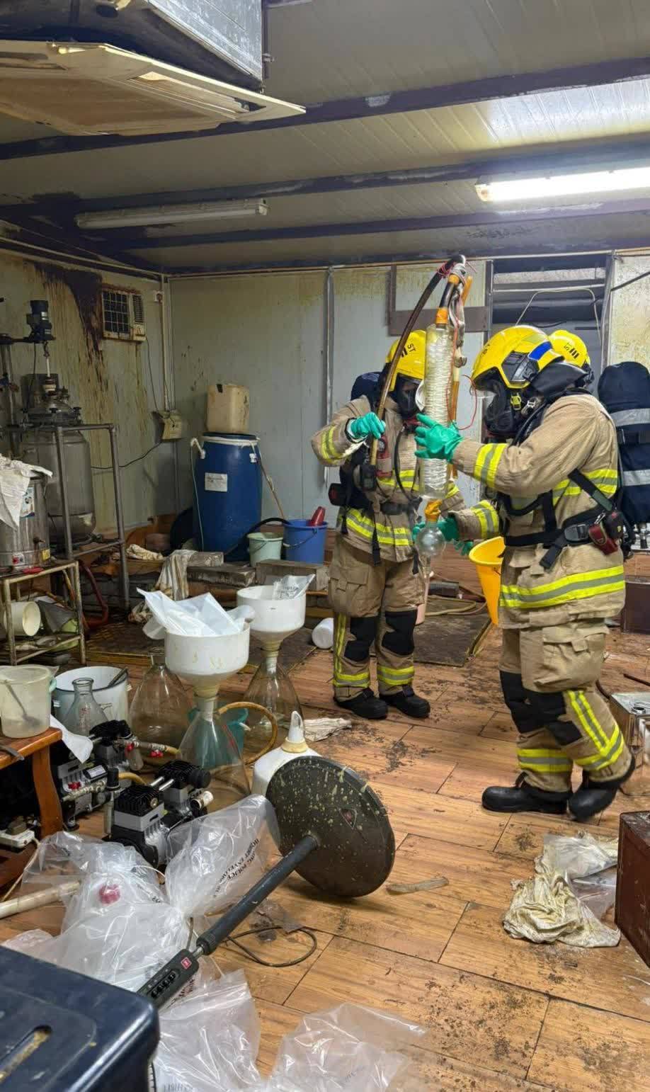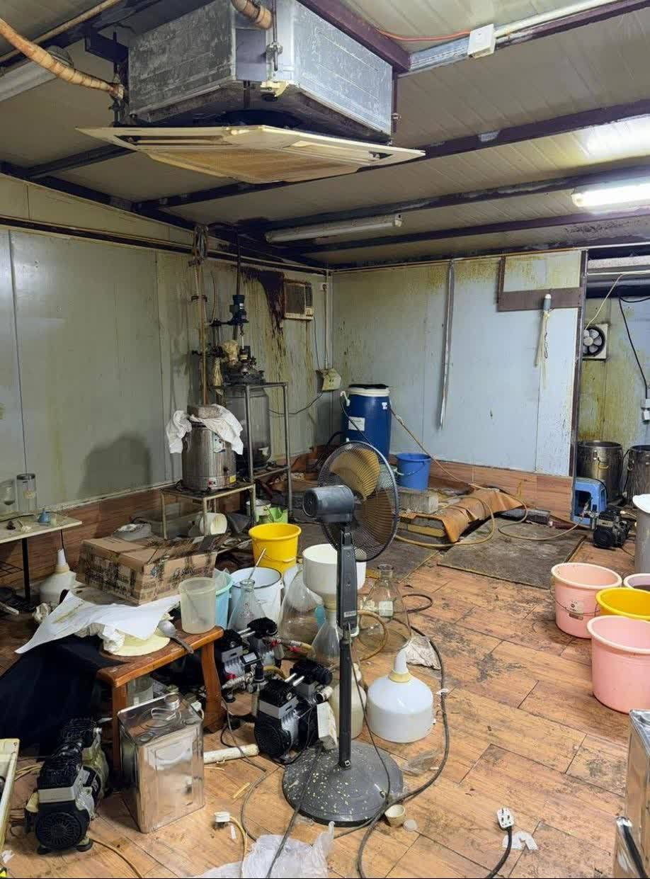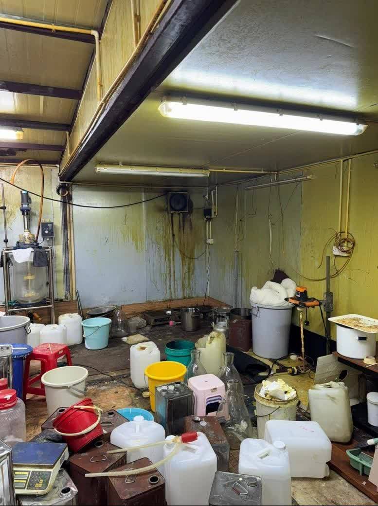 毒品调查科高级督察何灏庭1月9日表示,辟作制毒工场的铁皮屋约1000尺,放置大量制毒工具和化学物品,包括伪麻黄碱、二氯甲烷、乙醚等。人员另在隔篱一个货柜内检获约1公斤已制成的冰毒,以及在制毒工场旁边另一间由两名男女疑犯居住的铁皮屋内,检获少量冰毒和31公斤制毒原材料。由于现场放置的制毒工具和化学物品有一定危险性,事后需召援消防员及政府化验所人员到场协助处理及搜证。