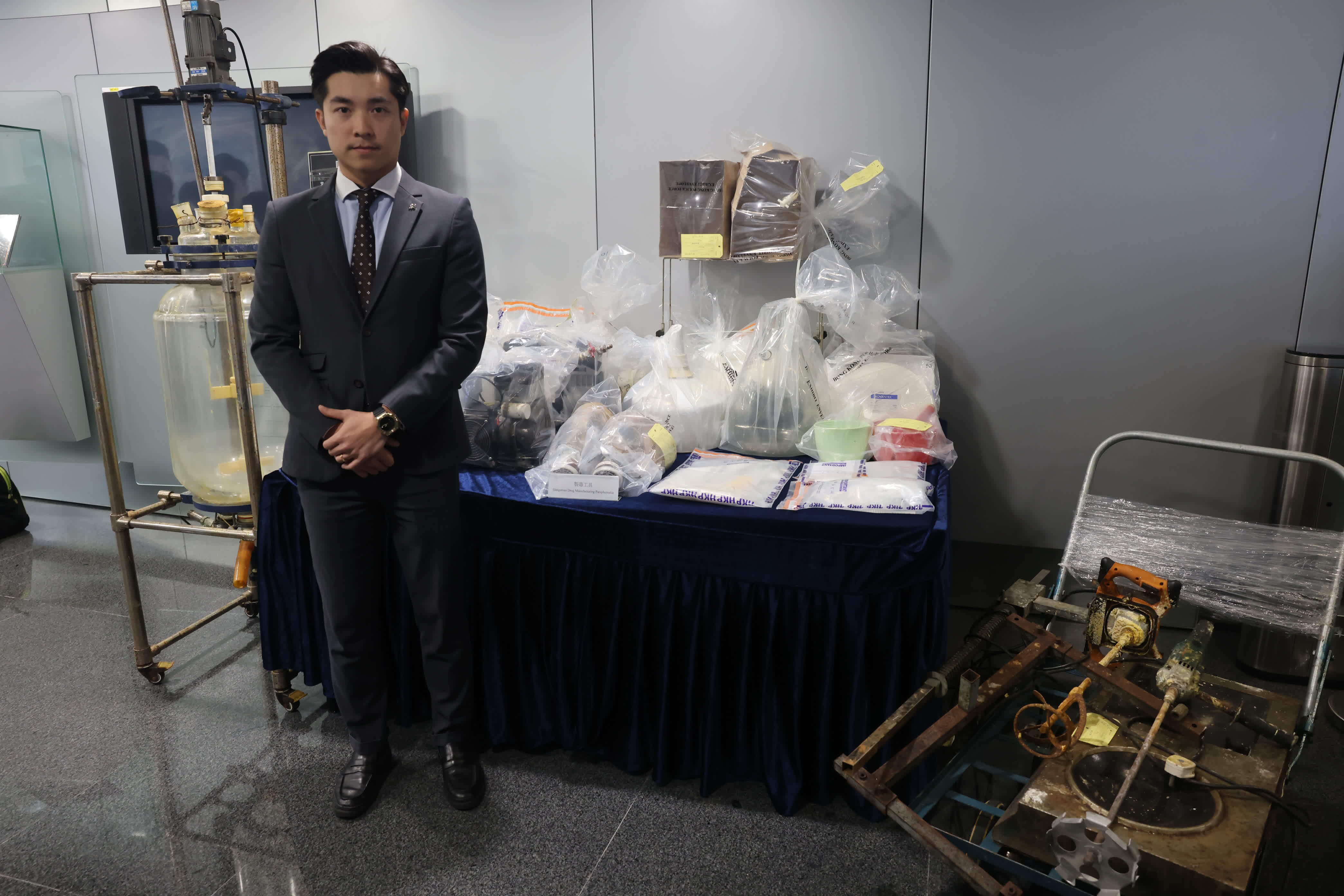 警方展示检获的大量制毒工具、制毒原材料及化学物品。香港文汇报记者刘友光摄