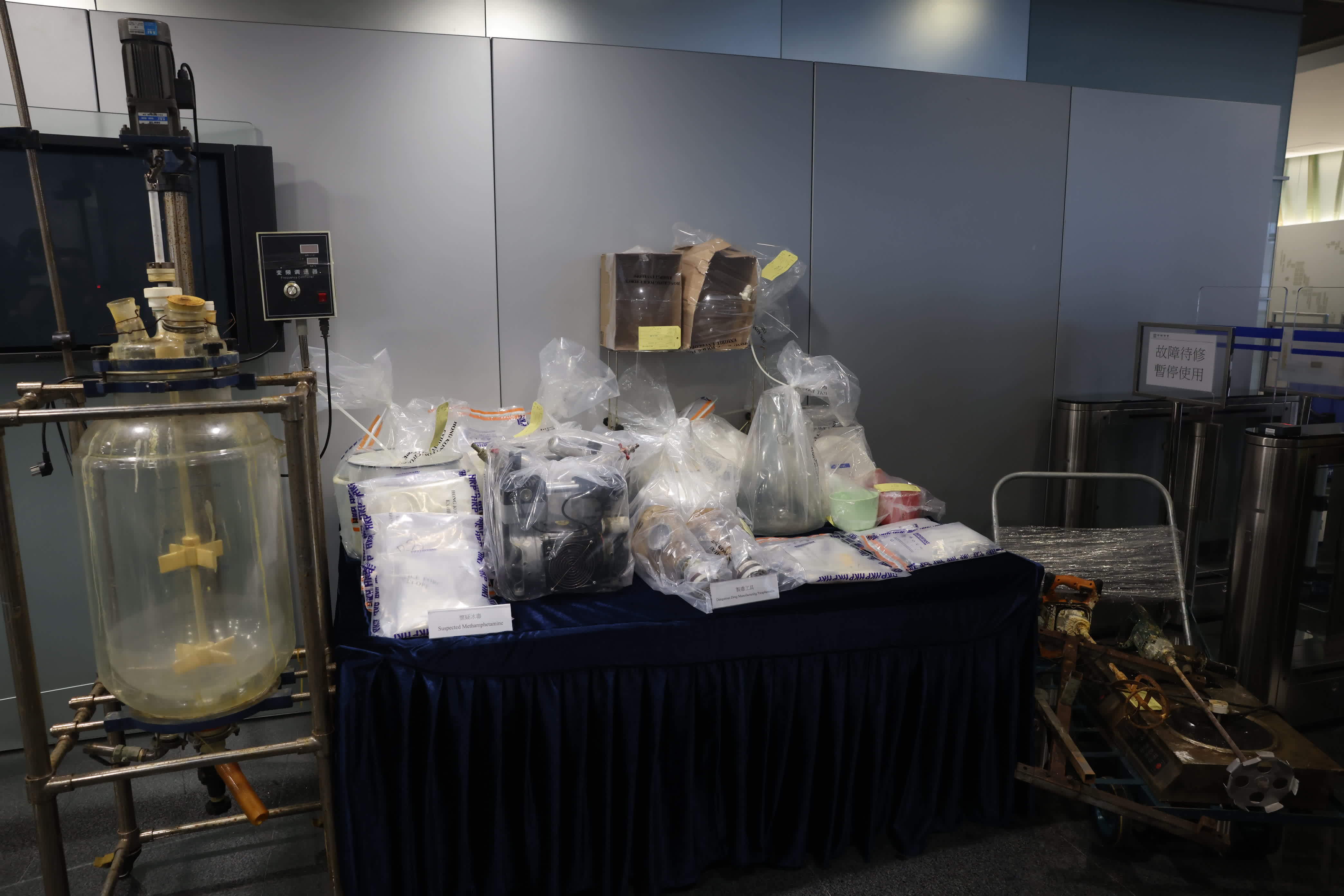 检获的制毒工具、制毒原材料及化学物品。香港文汇报记者刘友光摄