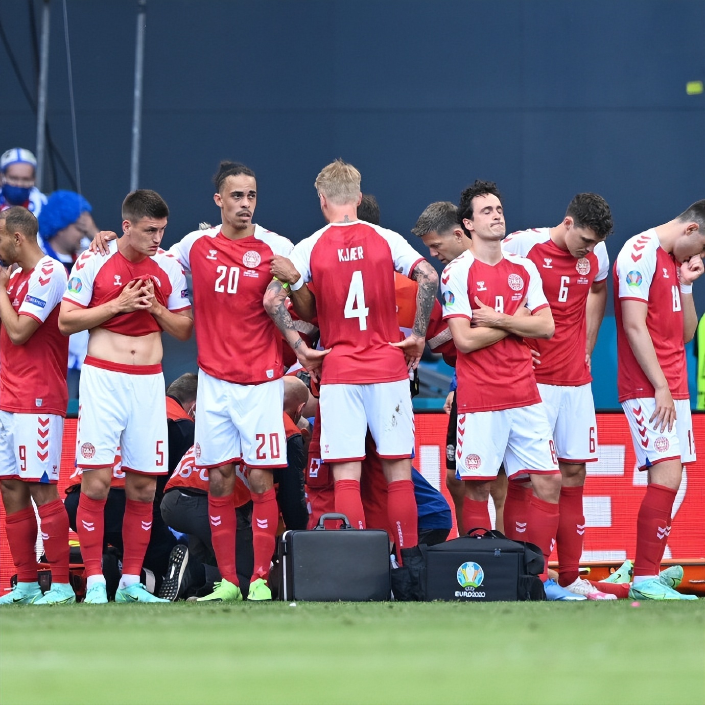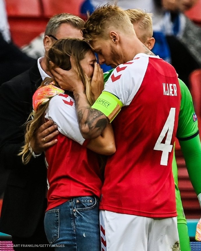 时间拨回2021年6月13日,在欧洲杯丹麦vs芬兰的小组赛上半场尾声,丹麦中场埃里克森突然心脏骤停倒地,队长克亚尔第一时间从后场冲到埃里克森身旁,检查其是否吐舌,马上为他做心肺复苏,并组织队友并肩组成保护埃里克森隐私的人墙,直至确保埃里克森接受救治。