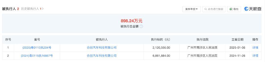 2024年,合创汽车作为被告的案件有百余起,目前官司已经排到了2025年的3月,已经有超过15家供应商和服务商就合同纠纷向广州市南沙区人民法院提起诉讼。截至目前,合创的被执行总金额高达898.24万元。